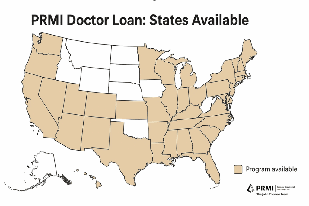 The PRMI Doctor Loan Program (Physician Mortgage) is a specialized mortgage for licensed medical professionals to purchase or rate/term refinance a primary residence with up to 100% financing, no mortgage insurance, flexible DTI (to 50%), and both fixed- and adjustable-rate options.
